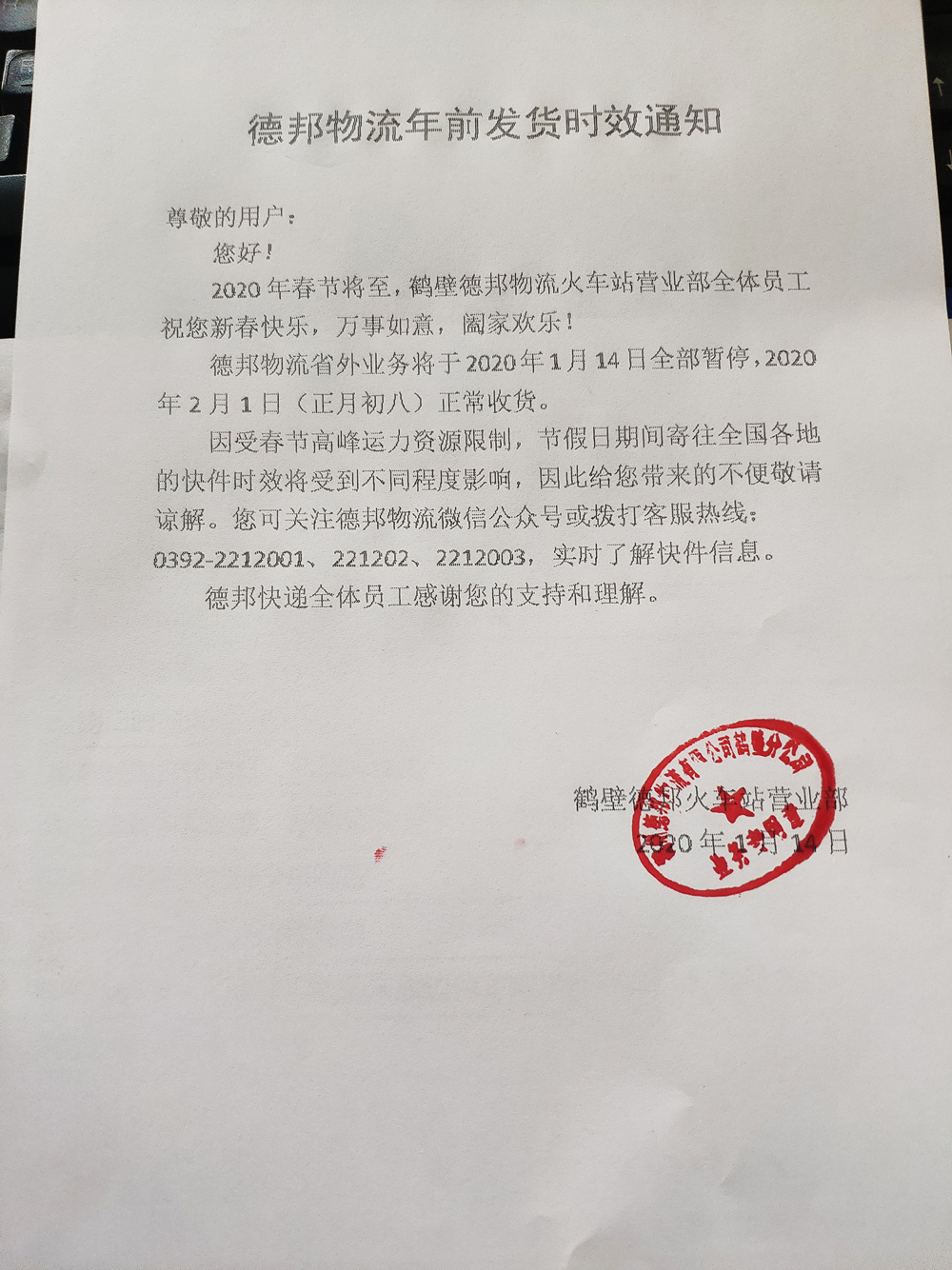 以上物流停止接貨當日及當日以后發(fā)出的貨物,我司不能保證正常的運輸到貨時效。
