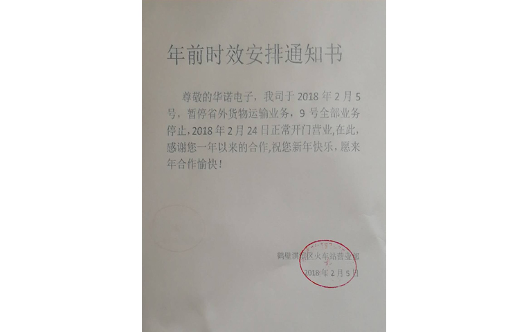 尊敬的新老客戶您好: 新春伊始,萬(wàn)象更新惜別2017年,迎來(lái)充滿希望的2018年,再次感謝新老客戶對(duì)鶴壁華諾電子的支持與信任。我們將繼續(xù)以優(yōu)質(zhì)的產(chǎn)品、真誠(chéng)細(xì)致的服務(wù)與您攜手在2018年,互惠雙贏、共同成長(zhǎng)。 2018年春節(jié)假期將至,為方便您合理安排訂貨時(shí)間、保證我司正常的供貨周期,現(xiàn)...